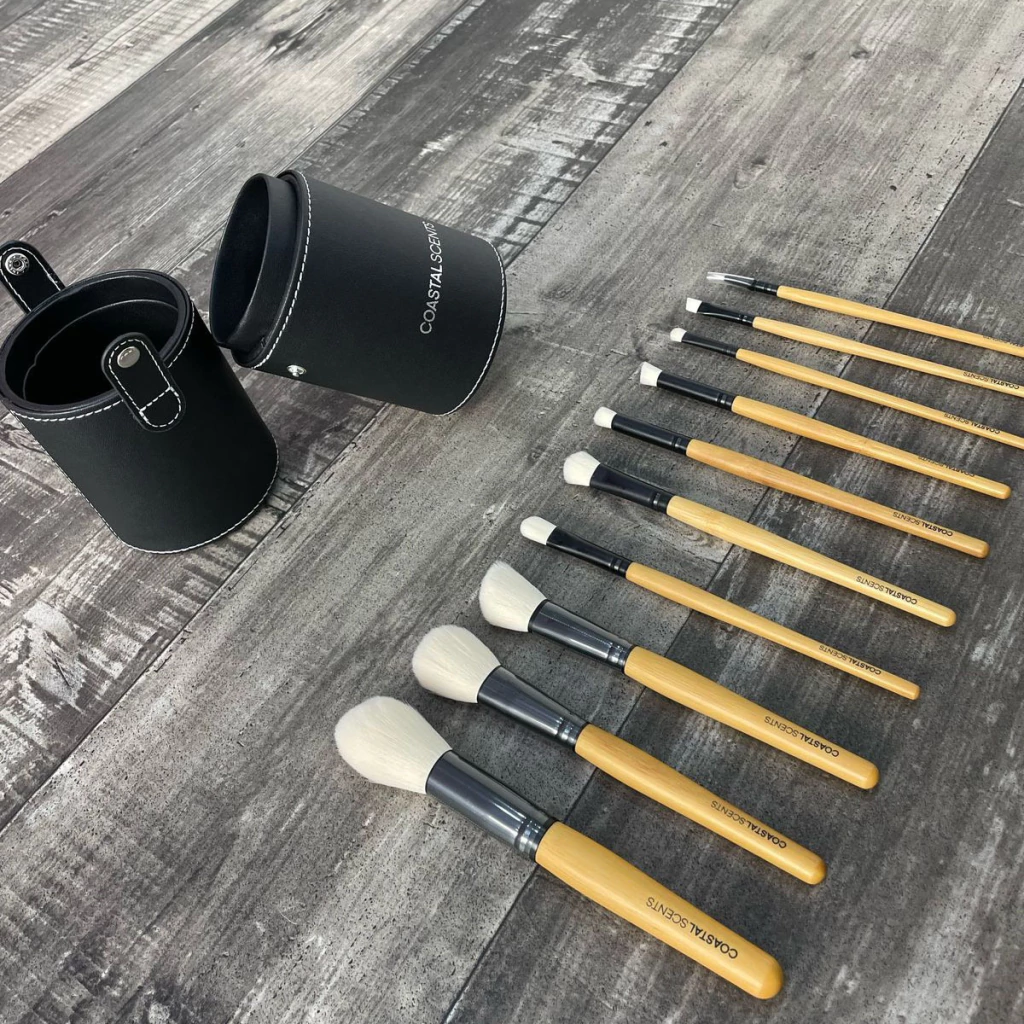 Las 10 brochas están empacadas en un estuche de eco cuero en forma de tubo para un fácil desplazamiento y almacenamiento.